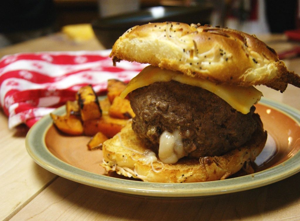 3. Top with a good Provolone or Feta cheese. Serve on a bun.